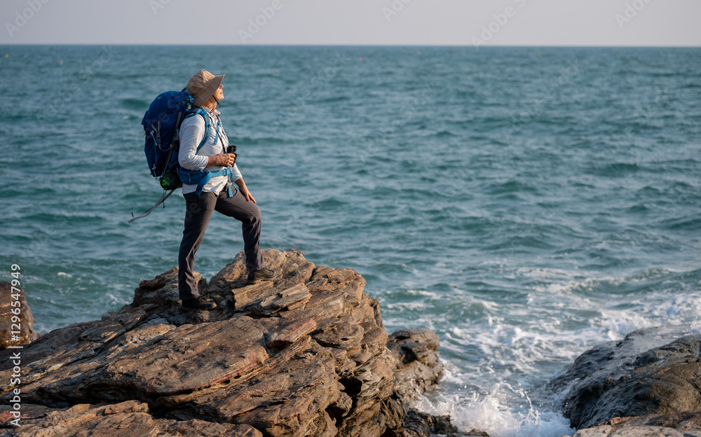 Senior woman is hiking outdoors, enjoying nature expression looks into the distance observing and possibly guide trekking and trail ecotourism adventure concept.