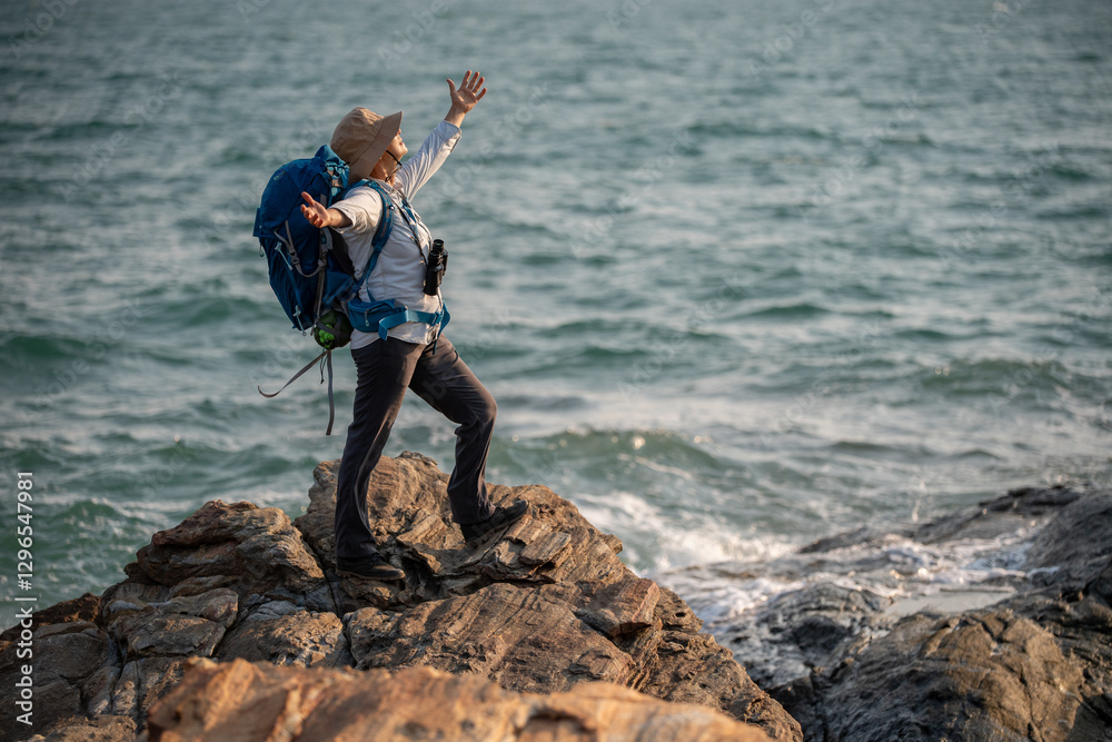 Senior woman is hiking outdoors, enjoying nature expression looks into the distance observing and possibly guide trekking and trail ecotourism adventure concept.