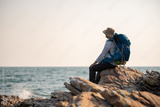 Senior woman is hiking outdoors, enjoying nature expression looks into the distance observing and possibly guide trekking and trail ecotourism adventure concept.