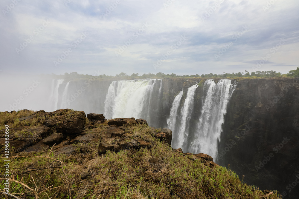 Majestic Victoria Falls cascading over cliffs in Zimbabwe during a cloudy day, highlighting the natural beauty of this UNESCO site