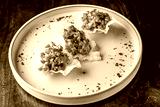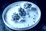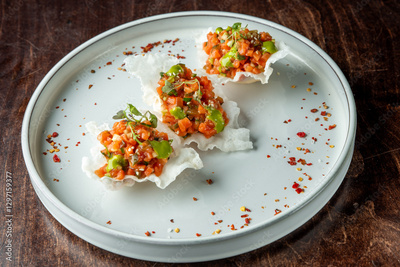 A gourmet dish on a pale plate featuring three crispy shells filled with a colorful mix of diced vegetables, garnished with microgreens and sprinkled with red chili flakes.