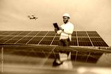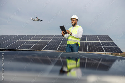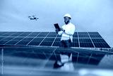 Happy interracial innovative engineer checking on solar panels on tablet with drone at solar farm.