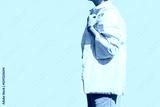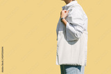 Woman hand holding eco bag. Female hold white canvas textille mesh zero waste shopper isolated on light yellow minimal wall background.. Blank mock up tote bag, place for text design logo.