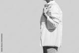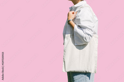 Woman hand holding eco bag. Female hold white canvas textille mesh zero waste shopper isolated on light pink minimal wall background.. Blank mock up tote bag, place for text design logo.