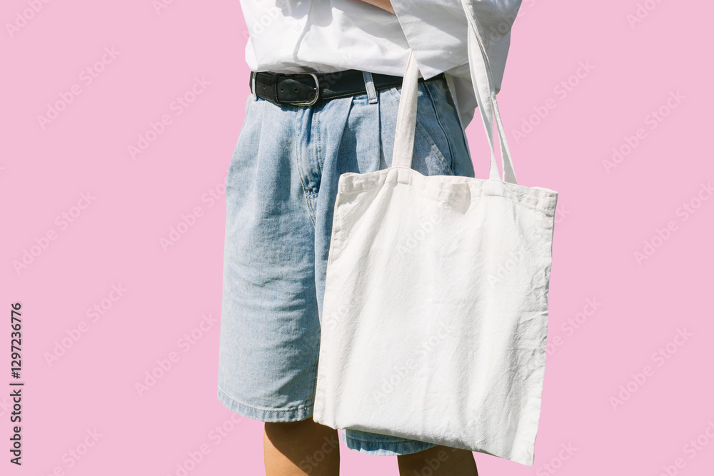 Woman hand holding eco bag. Female hold white canvas textille mesh zero waste shopper isolated on light pink minimal wall background.. Blank mock up tote bag, place for text design logo.