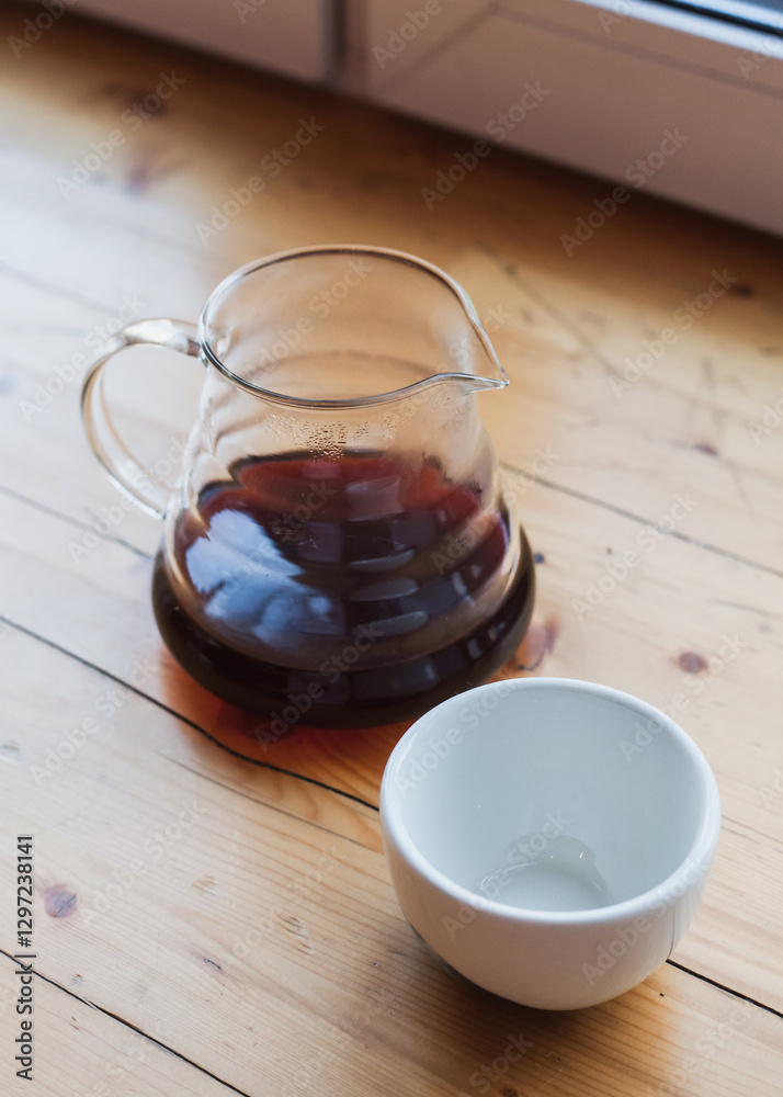 Glass server with black filter coffee inside and ceramic cup stand on wooden cafeteria table, day light from window. Making filtered coffee in coffee shop. Pour over method of alternative brewing, v60