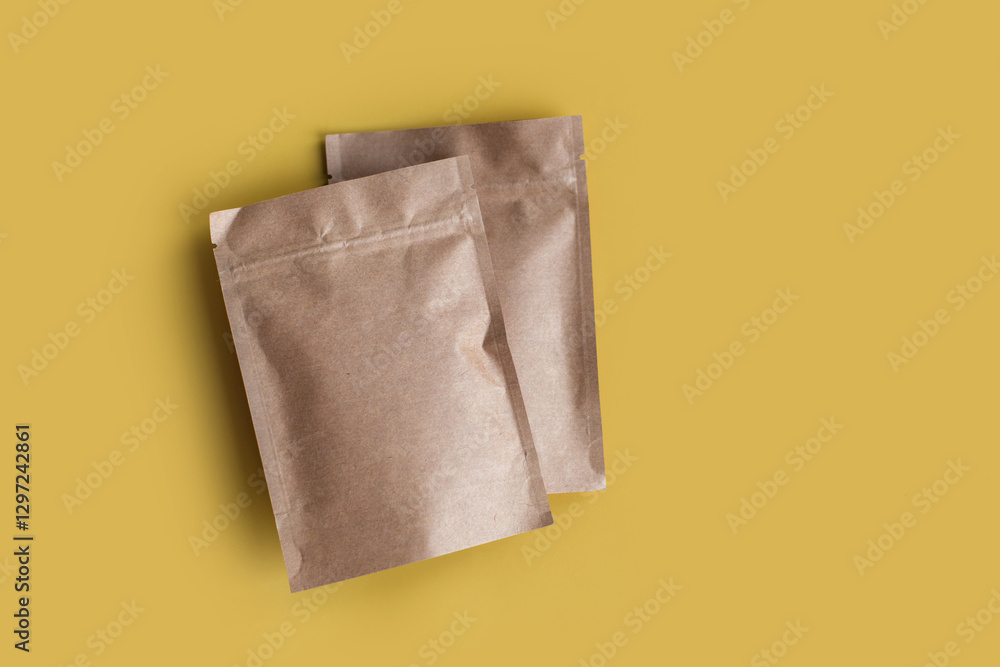 Kraft paper empty bags isolated in brown card box mock up on yellow background. Eco friendly pack with zipper, roasted specialty coffee beans, tea, snack, trendy concept. top view, flat lay
