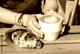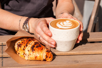French breakfast with hot cappuccino coffee and freshly baked croissant served on the table in the cafe terrace. takeaway meal food, morning sun light