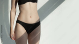 Unretouched skinny white young woman, slim body in black underwear on studio white wall background, sunny day light with shadows. perfect body positive concept, sporyy girl. fitness, healthy female