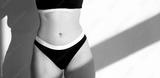 Unretouched skin, white slightly overweight young woman figure, curvy body in black underwear on studio minimal background. body positive concept, chubby girl. healthy plus size female belly and hips