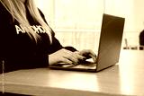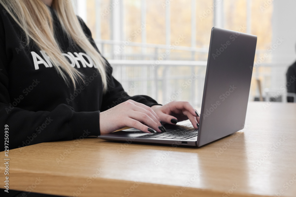 Young white caucasian woman working on computer on wooden table in home office. close up female businesswoman hands typing text on keyboard, surfing internet on modern laptop. mock up, top front view