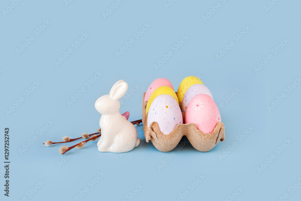 Happy easter decoration. White bunny decorative statuette, willow branch, basket with colorful eggs. Minimal festive composition on pastel light blue background. Copy space, place for text, front view