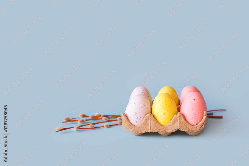 Eco basket with colorful paintedeaster eggs and willow branch on pastel light blue background. minimalistic decoration, minimal composition. Front view, place for text, banner