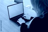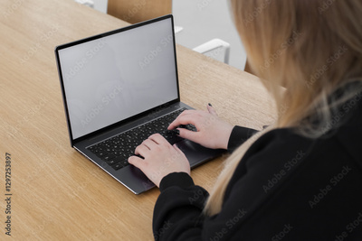 Young white woman working on computer with blank copy space screen on table in home office. close up female businesswoman hands typing text, surfing internet on modern laptop. mock up, front view