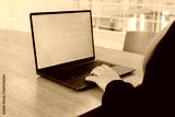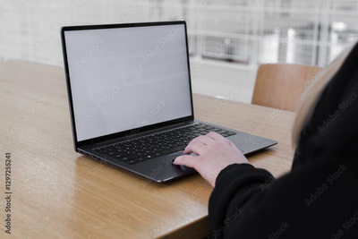 Young white woman working on computer with blank copy space screen on table in home office. close up female businesswoman hands typing text, surfing internet on modern laptop. mock up, front view