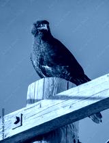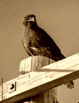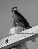 Swainson's hawk perched on a wooden post against blue sky