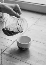 Barista pouring filter coffee from kettle to a ceramic white cup. female or man hand holding glass teapot server with black pour over coffee. alternative brewing, specialty v60. background light wood