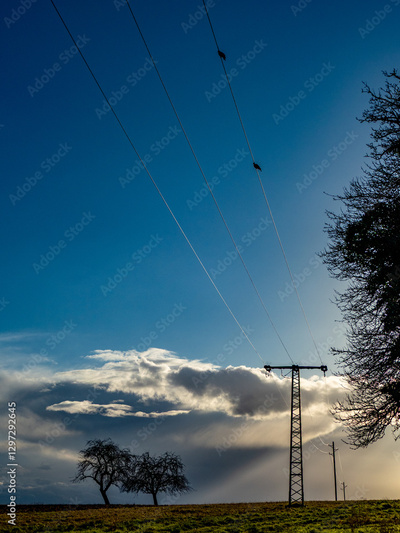Hochspannungsmasten und starker Wolkenhimmel