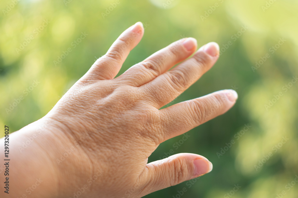 Close-up wrinkled mature female hand, palm against soft green background, Nature and Aging gracefully, essence aging and richness life experiences