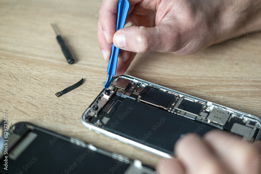 Hands repairing smartphone hardware with small tools. Mobile phone maintenance, repair service and technology concept, technical support, service center, display replacement