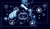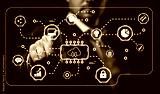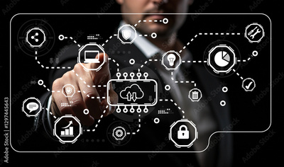 Businessman Interacting With Digital Interface Displaying Data Network Security Technology and Cloud Computing Concepts in Modern Corporate Environment