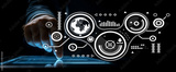 Hand Touching Digital Touchscreen with Global Connection Symbols and Data Analytics Icons in a Futuristic Technology Concept