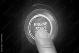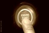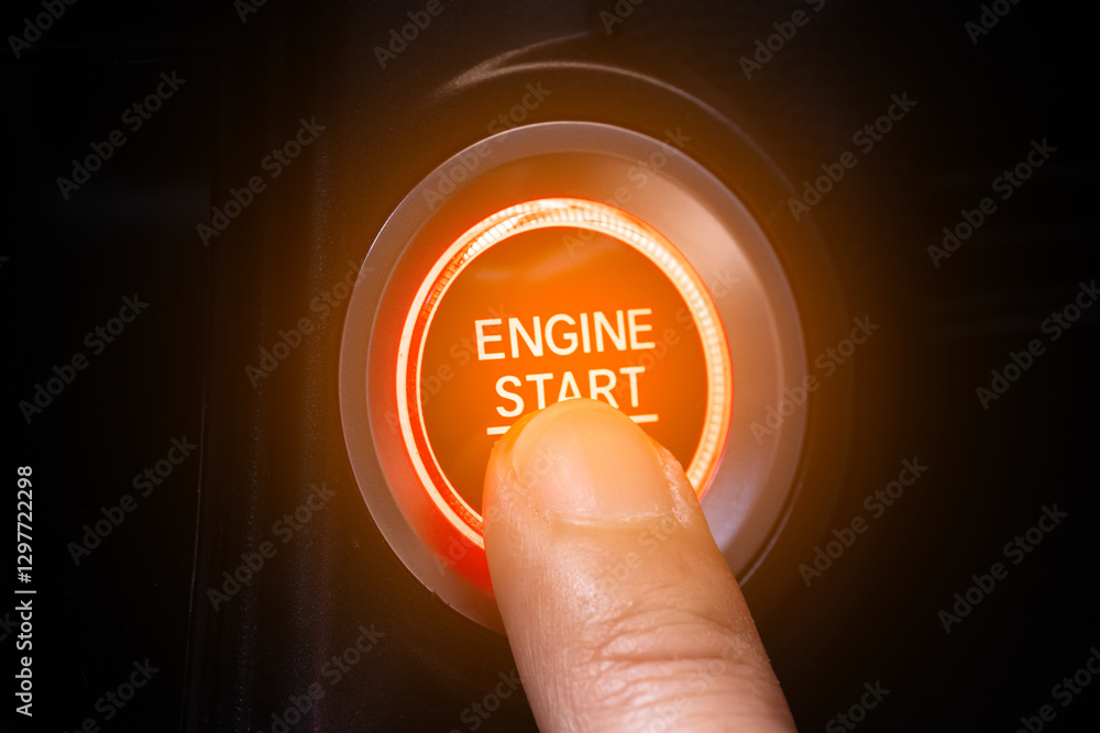The driver's hand is pressing the car start button. Concept of transportation and technology