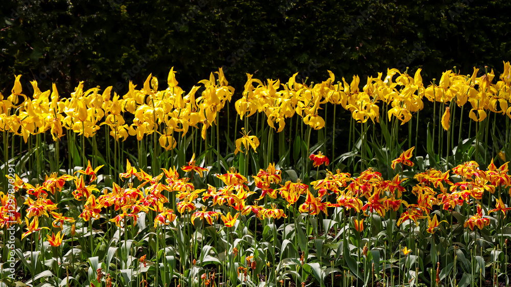 Close up view of rows of tulip flowers in Keukenhof gardens