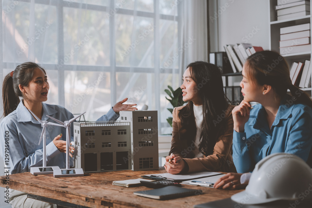 Three female engineers meeting in the office, discussing a sustainable building project with a model and wind turbines, highlighting their commitment to eco-friendly construction
