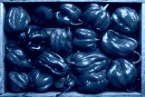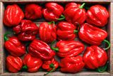 Wooden box filled with ripened red habanero peppers (capsicum chinense) close up. Very hot mexican peppers