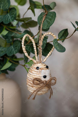 Easter decoration. Vase with green plant and hanging eggs