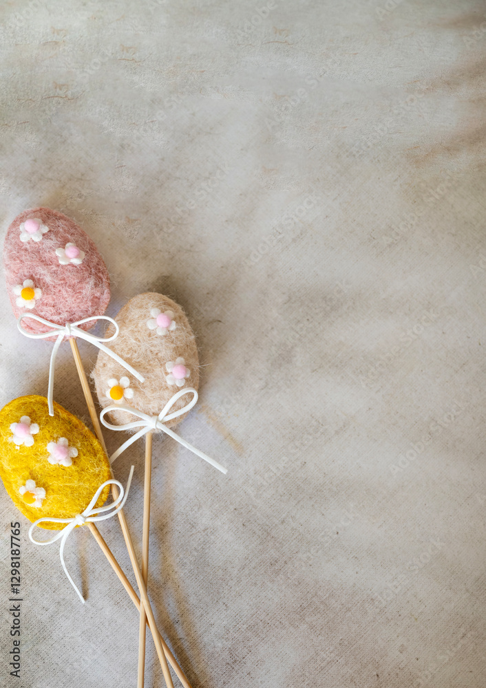 Fabric Easter eggs with sticks on shadows background