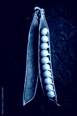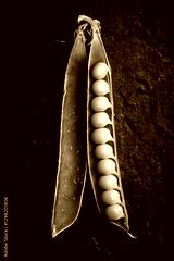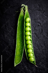 Green sugar snap pea pod with kernels in a row on black background close up. Food photography