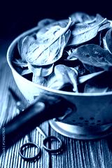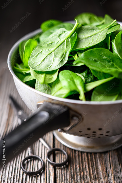 Close up of freshly washed green spinach leaves in a metal colander with scissors on rustic wooden table. Raw organic baby spinach heap close up