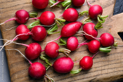 Freshly washed organic radish on wooden cutting board close up. Food photography