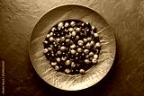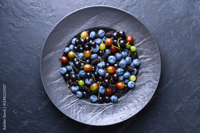 Fresh mixed berries, including blueberries, blackcurrants, and mulberries, in a black plate on dark background. Detailed food photography