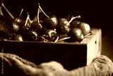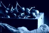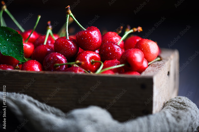 Freshly washed ripe juicy red cherries with water droplets in wooden box. Food photography