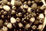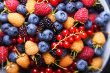 Close up of multicolored mixed summer berries: blueberries, raspberries, redcurrant, blackcurrant and mulberries. Food photography