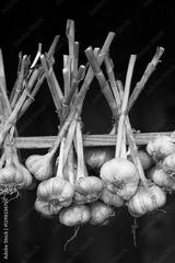 Rustic bundles of garlic drying in the fresh air. Natural and organic food photography