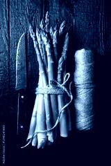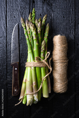 Top view of a bunch of fresh asparagus sprouts with a skein of twine and knife on an old black wooden table. Rustic food photography.