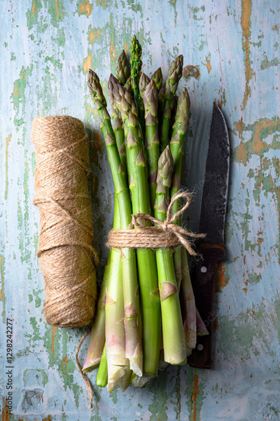 Bunch of green asparagus and a roll of twine on an aged wooden table. Overhead food photography concept