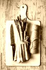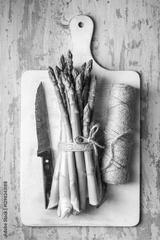Freshly harvested asparagus sprouts with twine and knife on a white cutting board on a rustic wooden table. Top view culinary photography
