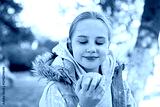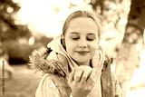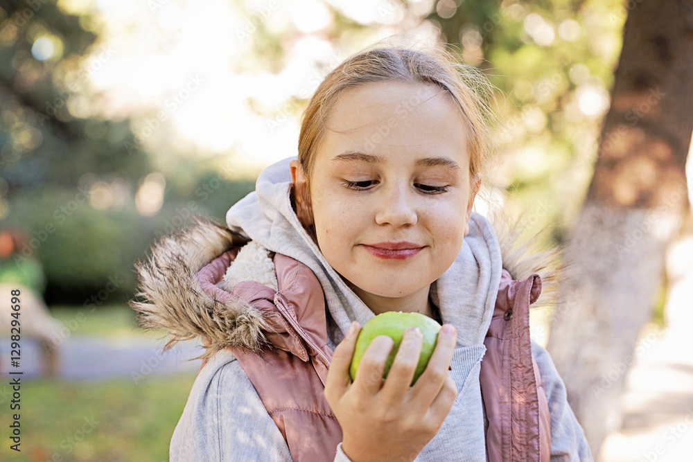 Smiling young girl eating green apple outdoors, portrait. Child 11 years old