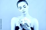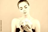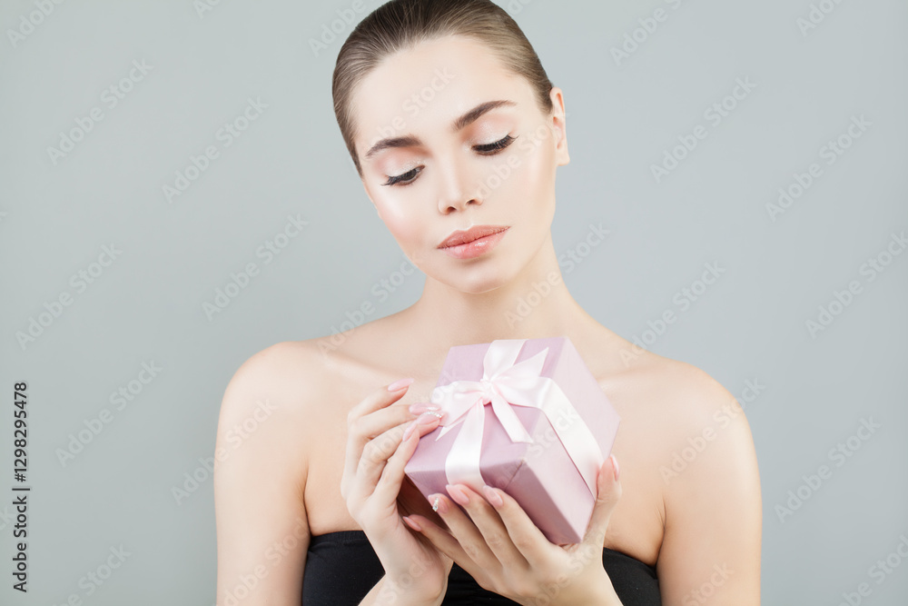 Pretty young happy woman holding gift present box on grey studio wall background, fashion beauty portrait