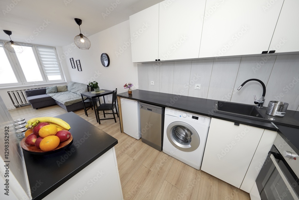 Kuchnia w nowoczesnym apartamencie w jasnym kolorze z czarnym blatem, owoce
