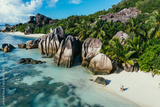 "La digue" island in Seychelles. Silver beach with granitic stone, and jungle. Man enjoying vacations and relaxing on the beach. Aerial view shot with mavic2