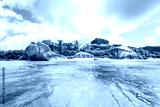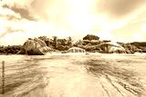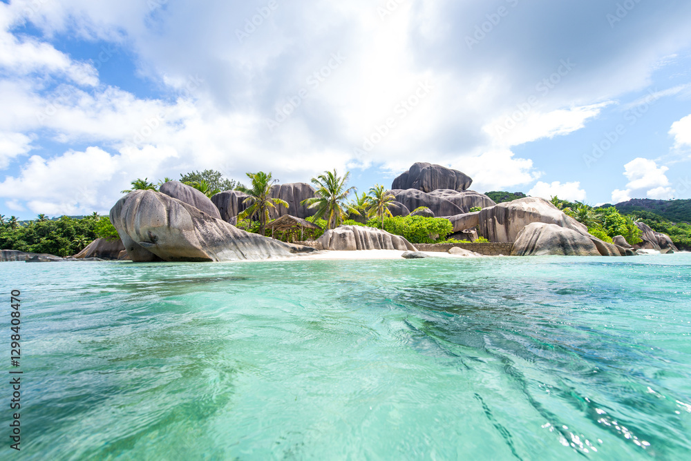 Beautiful island in the seychelles. La digue, anse d'argent beach. Water flowing, and waves foam on a tropical landscape