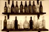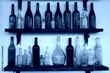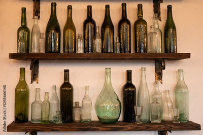 antique vintage bottles of different shapes and sizes made of multi-colored glass on a wooden shelf,