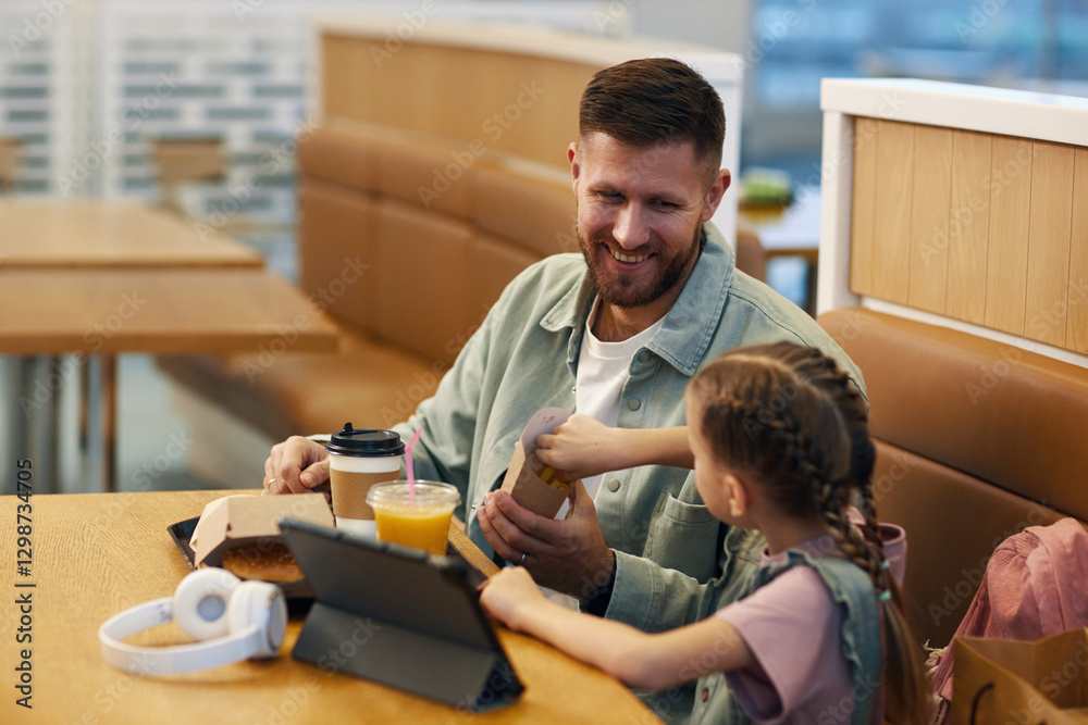 High angle shot of young father smiling widely while holding pack of french fries while his little girl taking it
