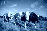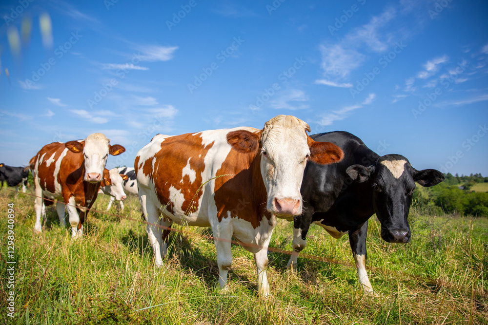 Troupeau de vache laitière en pleine nature en train de brouter l'herbe vert dans la campagne.